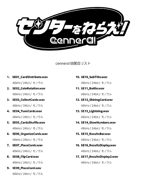 | 内容 | SE01_CardDistribute.wav SE02_CoinRotation.wav SE03_CollectCards.wav SE04_TuenCards.wav SE05_CardsShuffle.wav SE06_OrganizeCards.wav SE07_PlaceCards.wav SE08_FlipCard.wav SE09_PlaceCard.wav SE10_SubTitle.wav SE11_Battle.wav SE12_ShiningCard.wav SE13_Lightning.wav SE14_GlowNumbers.wav SE15_ResultsBar.wav SE16_ResultsDisplay.wav SE17_ResultsDisplay2.wav cennera!効果音リスト.pdf ガイドライン.pdf |